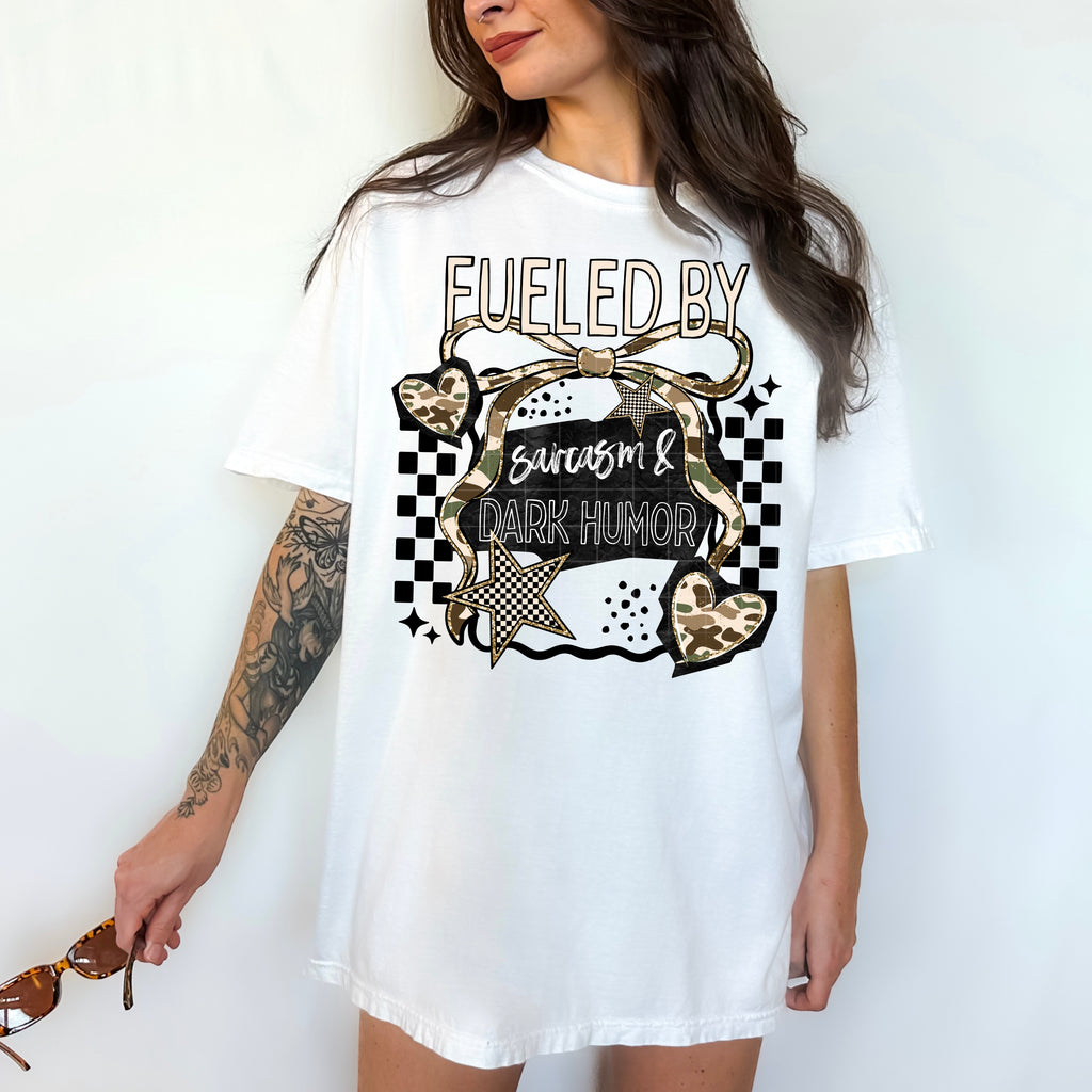 DTF Full Color TShirt Transfer - Fueled By Sarcasm & Dark Humor - (Black or White)